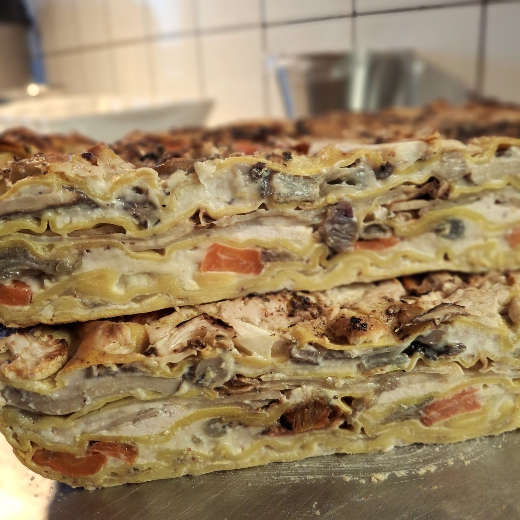 Mellan lagren gick vi all in på grönsaker: rostade morötter, karamelliserad schalottenlök, varsamt bräserad kål och ugnsrostade portabellosvampar. Allt tillagat separat, med tid och respekt. Till det krämiga toppskiktet testade vi Bianco en vegansk ost från